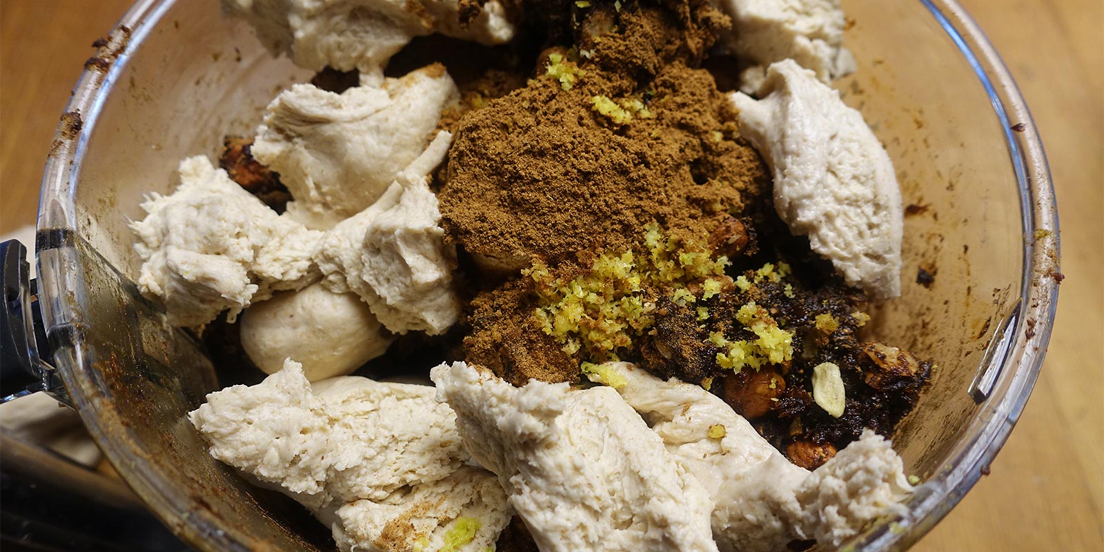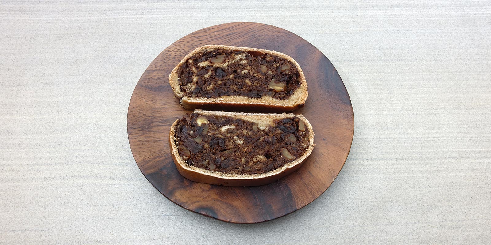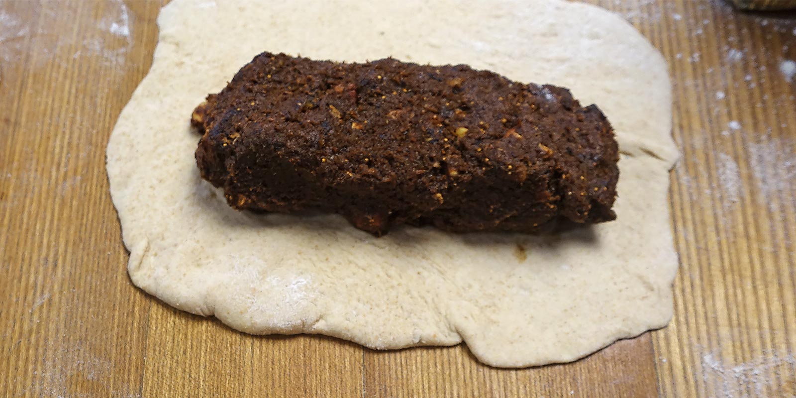 Die weichen, fein geschnittenen Dörrbirnen mit den Baumnüssen, dem Orangeat und Zitronat und den Gewürzen gut von Hand vermischen. Einen Drittel des Hefeteiges in kleine Stücke schneiden und in die Birnenfüllung kneten. Den restlichen Hefeteig in vier Stücke schneiden und jedes Teigstück 1/2 cm dick zu einem Rechteck auswallen.