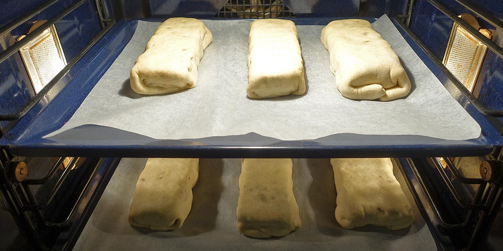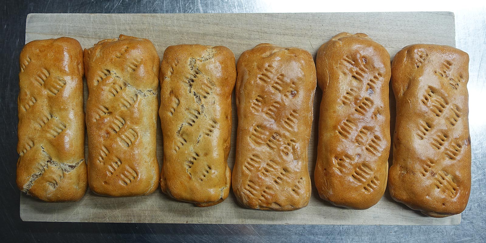 Die Birnenfüllung als Block in die Teigmitte legen, den Block mit dem Teig einschlagen. Das Birnbrot mit der Naht nach unten auf ein Backblech mit Backpapier legen. Die Birnbrote ca. 40 Minuten in einem 30°C warmen Backofen aufgehen lassen. Mit Ei bepinseln, mit der Gabel einstechen. Im 175°C heissen Ofen während 50 Minuten backen.