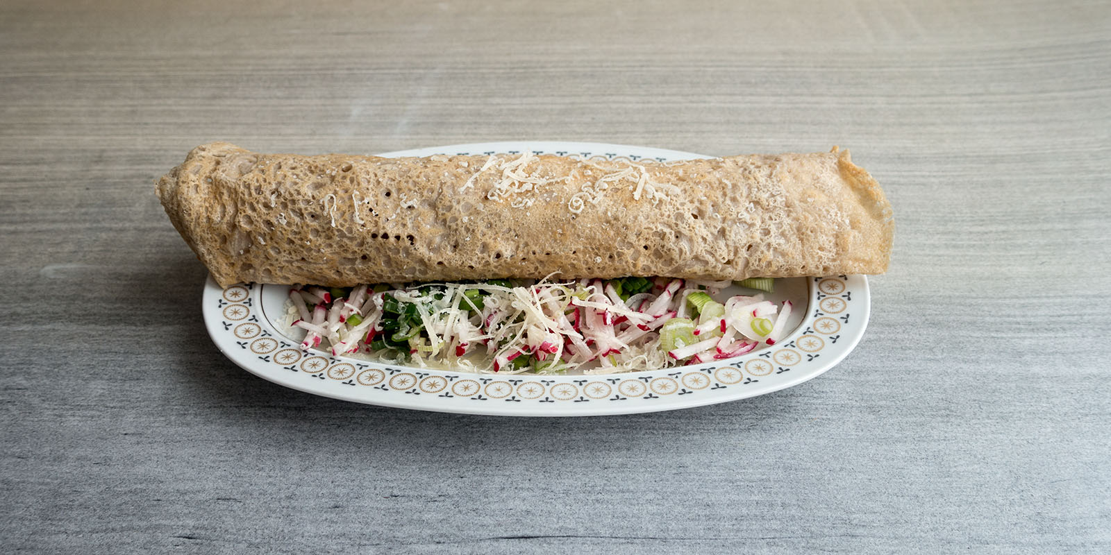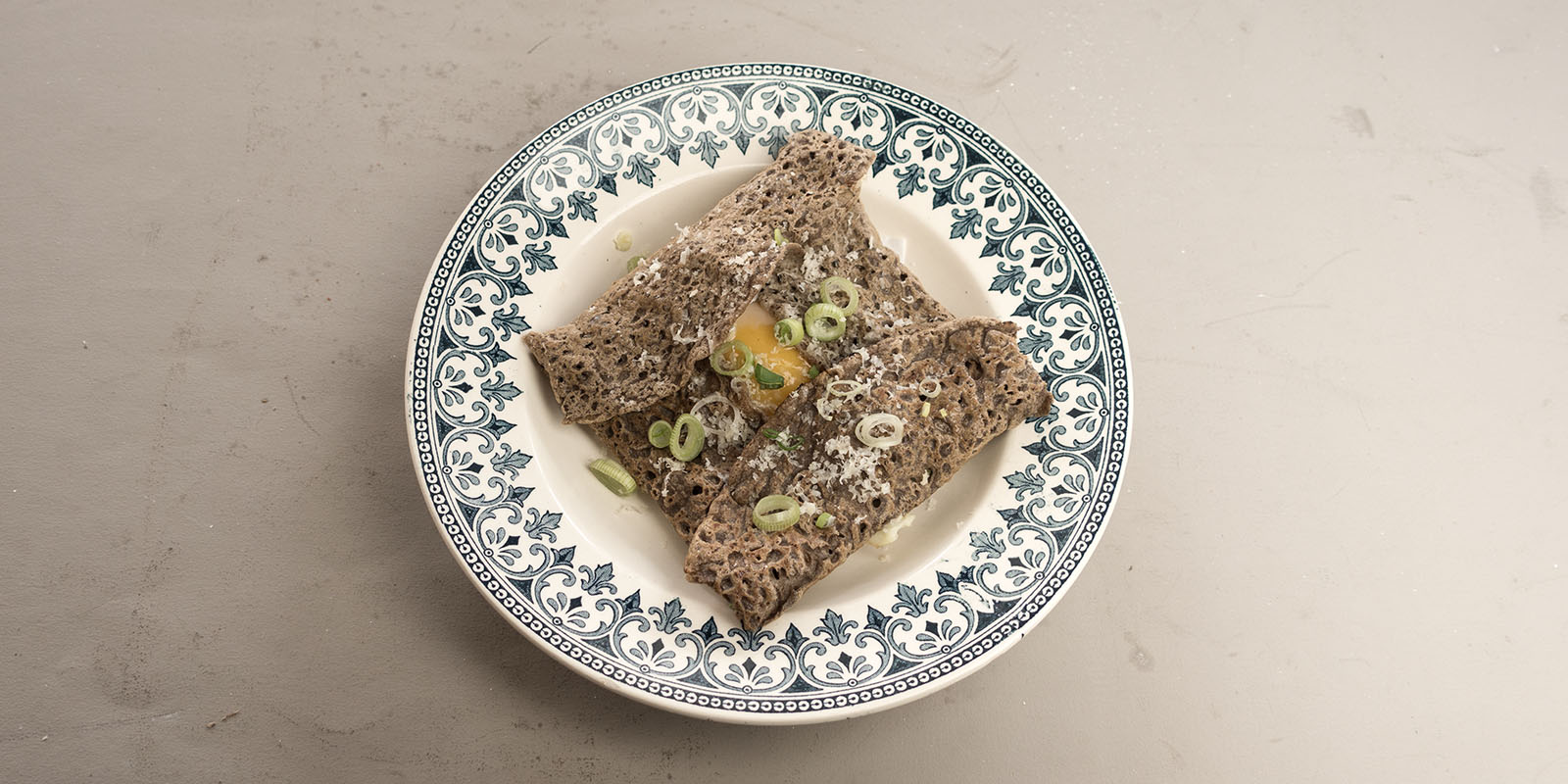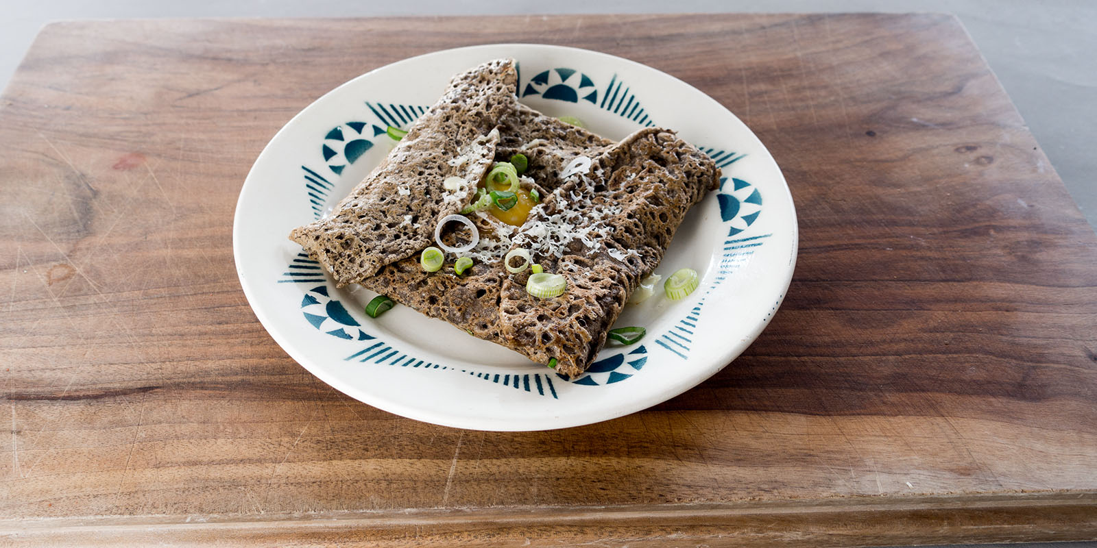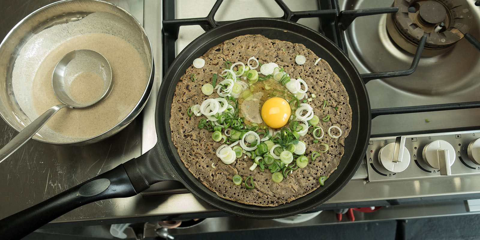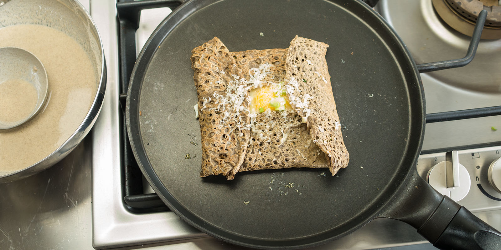 5| Die Galetten können auch gefüllt werden. Die Galetten in der Bratpfanne belassen, mit Frühlingszwiebeln, Gemüsejulienne oder Kräutern bestreuen, ein rohes Ei darauf geben und mit geriebenem Käse, Salz und Pfeffer würzen. Alle vier Seiten der Galette zur Mitte einschlagen und bei mässiger Temperatur das Ei leicht stocken lassen. Um den Garvorgang zu beschleunigen, kann ein passender Deckel aufgesetzt werden. Die kleine Mahlzeit mit einem Spachtel auf einen Teller gleiten lassen.