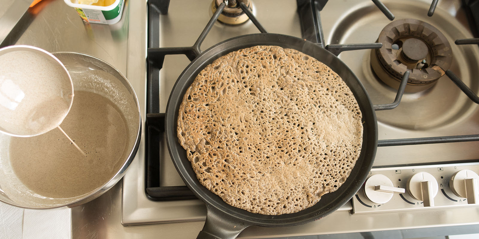 Tip: Wenn sich zu wenig Bläschen bilden, kann vor dem Backen mit 1/3 TL Backpulver nachgeholfen werden. Ein angesäuerter Buchweizenteig lässt sich problemlos 1-2 Wochen im Kühlschrank lagern. Vor dem Verwenden mit 50g Buchweizenmehl und 100g Wasser ergänzen. Salzen nicht vergessen.