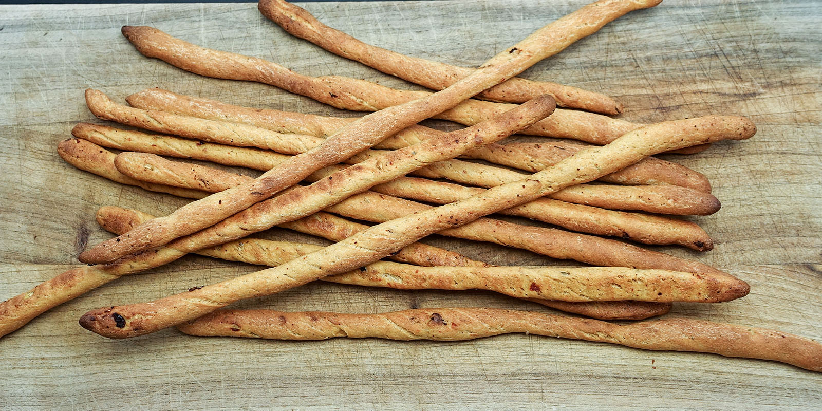 3| Teig in Portionenstücke schneiden und davon Teigrollen von ca. 1cm Breite und 30cm Länge ausrollen, dazu kein Mehl verwenden. Auf ein mit Pergament belegtes Backblech legen. Die ungebackenen Grissini mit der restlichen Marinade bepinseln und nochmals ca. 30 Minuten aufgehen lassen. In der unteren Hälfte des auf 220°C vorgeheizten Ofens während 12-15 Minuten backen, bis die Grissini hellbraun sind. Grissini auf einem Gitter auskühlen lassen.